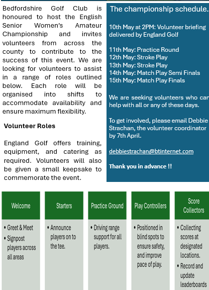 Bedfordshire GC has been selected to host the EG Women's Seniors Amateur Championships. We as a county are tremendously proud  of the Club and it's a great reward for all the hard work the team the Bedfordshire have put in over the year. It really is a privilege. The details are on the poster and they are looking for volunteers  to help during the week. You can also just go along and watch so great golf.